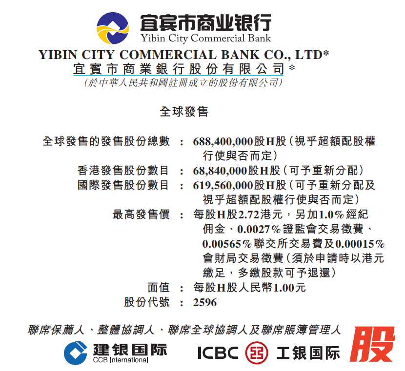 【大河财立方消息】12月30日,宜宾市商业银行(简称宜宾银行)在港交所公告称可盈配资,拟香港IPO发售6.884亿股股份,2024年12月30日至2025年1月8日招股;发售价将为每股发售股份2.59港元~2.72港元,每手买卖单位为1000股,建银国际、工银国际为联席保荐人;预期股份将于2025年1月13日开始在港交所买卖。截至最后实际可行日期,四川省宜宾五粮液集团有限公司直接持有公司约19.99%股份。