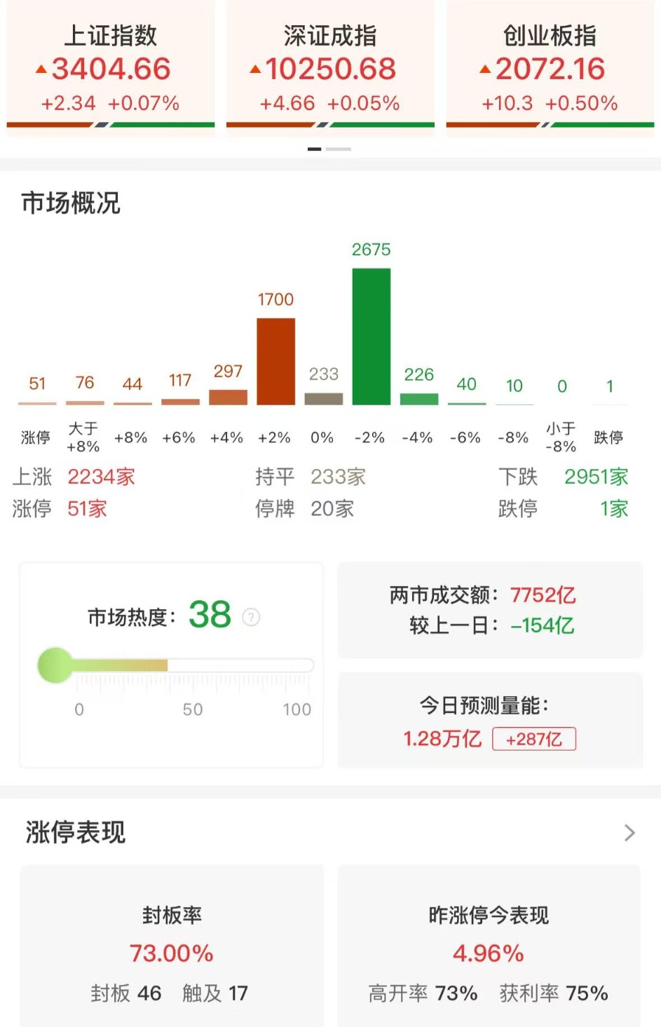 财联社6月12日电,市场早盘低开反弹,创业板指领涨。沪深两市半日成交额7752亿,较上个交易日缩量154亿。盘面上热点快速轮动,10多个热点轮番活跃,个股跌多涨少,全市场超2900只个股下跌。从板块来看,IP经济概念股持续活跃,德艺文创等10余股涨停。CPO等算力硬件股再度走强,天孚通信涨超10%。核电股展开反弹,融发核电涨停。下跌方面,港口航运股展开调整,连云港跌超5%。板块方面,量子科技、CPO、可控核聚变、IP经济等板块涨幅居前,农业、猪肉、港口、饮料制造等板块跌幅居前。截至收盘,沪指涨0.07%,深成指涨0.05%,创业板指涨0.5%。