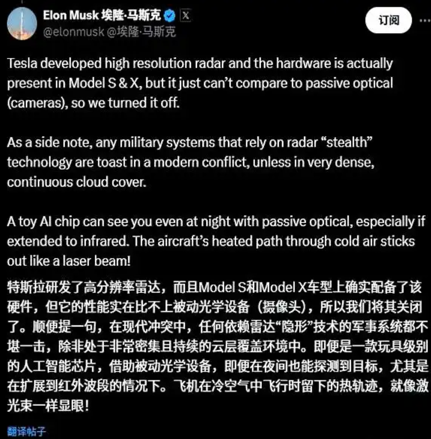 特斯拉的车型到目前为止一直采用纯视觉方案涵乔财富,靠8个摄像头完成对环境的感知。其实在2021年的时候就有人提问马斯克为什么不考虑激光雷达的相关方案。马斯克倒也直白,称Model S/X曾搭载过自研高分辨率雷达,但实测性能“远不及被动光学”,遂彻底停用。简单说就是尝试过,不好用,放弃。