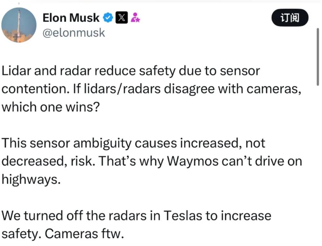 马斯克称Waymo的自动驾驶激光雷达方案在恶劣天气条件下,如降雪、降雨甚至沙尘暴等场景中,激光雷达会陷入导航困境。并表示:“受反射散射影响,激光雷达在雪、雨或沙尘环境下表现糟糕,这也是Waymo在强降水天气里完全无法行驶的原因。”